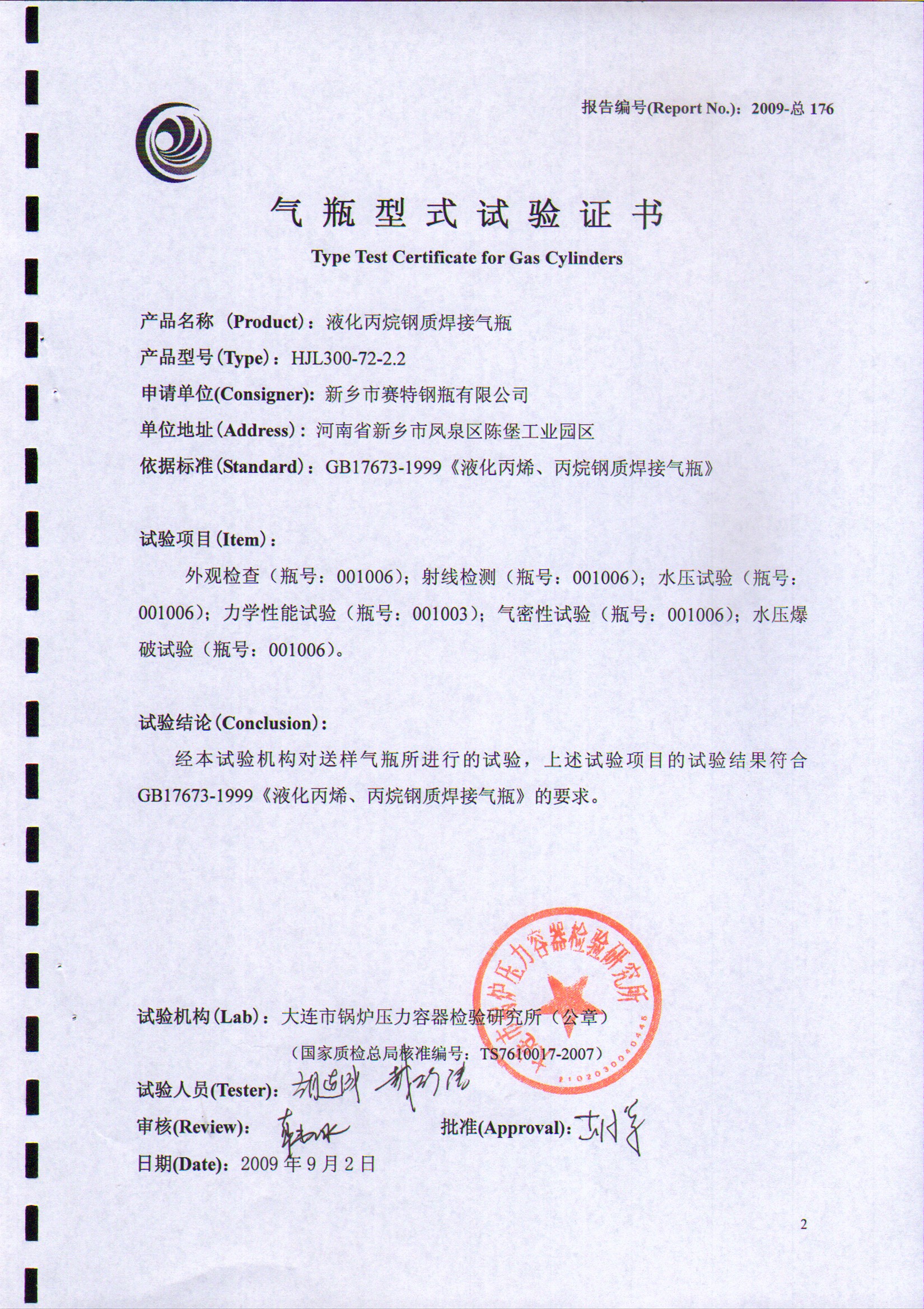 HJLII300-72-2.2T液化丙烷鋼瓶型式試驗(yàn)證書